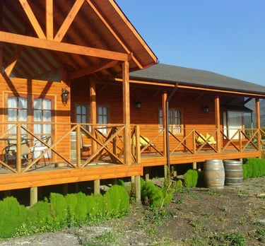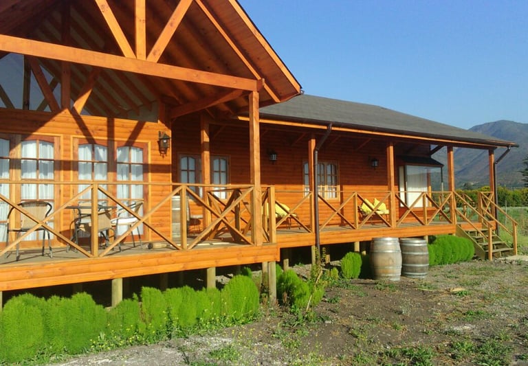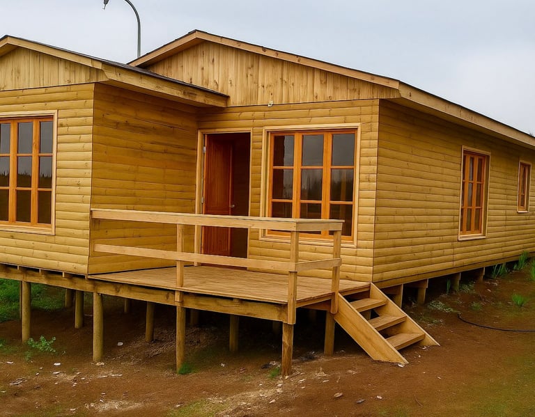 Modelo de casa con techo a seis aguas , madera revestimiento exterior con tronco medialuna impregnado para mayor durabilidad.